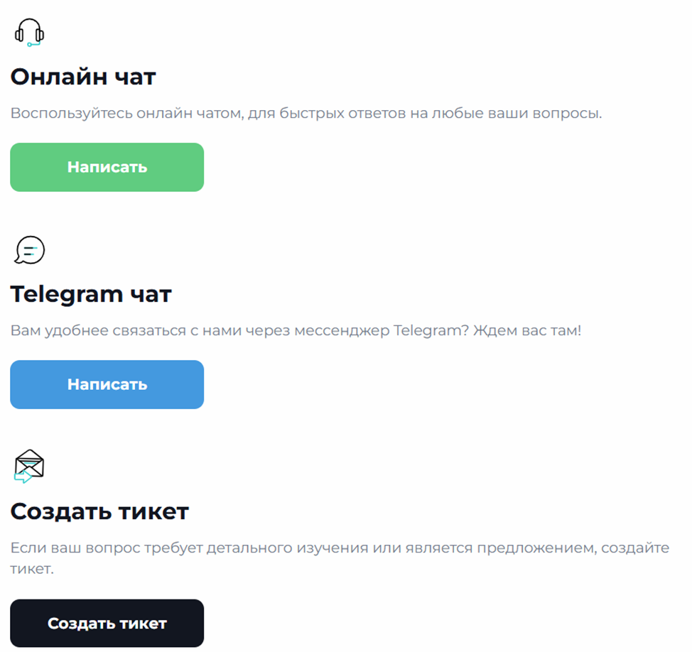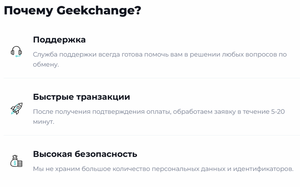 На сайте клиенты могут изучить правила использования платформы и узнать о ее преимуществах, таких как: скорость обработки заявок, безопасность и достойное обслуживание, реализованное за счет оперативной поддержки.Связаться с представителями технической поддержки клиенты могут через чат на сайте, профиль в тг или форму для отзывов на Geek Change.