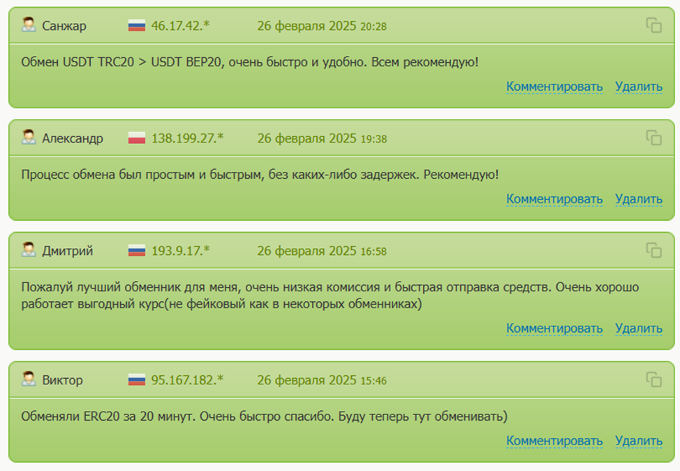 На основном ресурсе проекта есть отдельный блок, посвященный мнению клиентов. Здесь люди в основном пишут позитивные комментарии об этом обменнике. Большинство пользователей в первую очередь отмечают хорошие курсы.