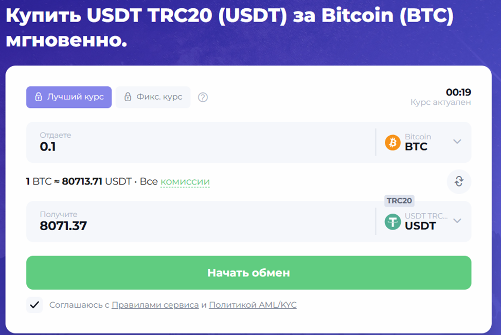 На сайте сервиса доступен обмен крипты на фиат и наоборот. Комиссия при этом не является фиксированной, то есть ее величина зависит от выбранного вида денег и активов.