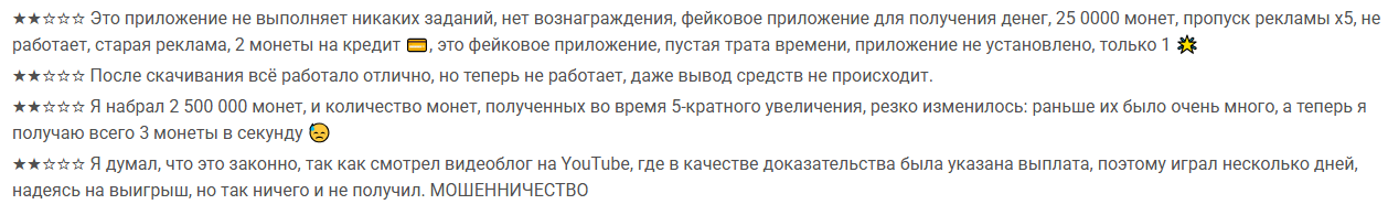 В негативных комментариях люди жалуются на проблемы с выводом. Некоторые пользователи пишут, что набрать нужное количество монет невозможно независимо ни от чего.