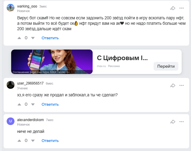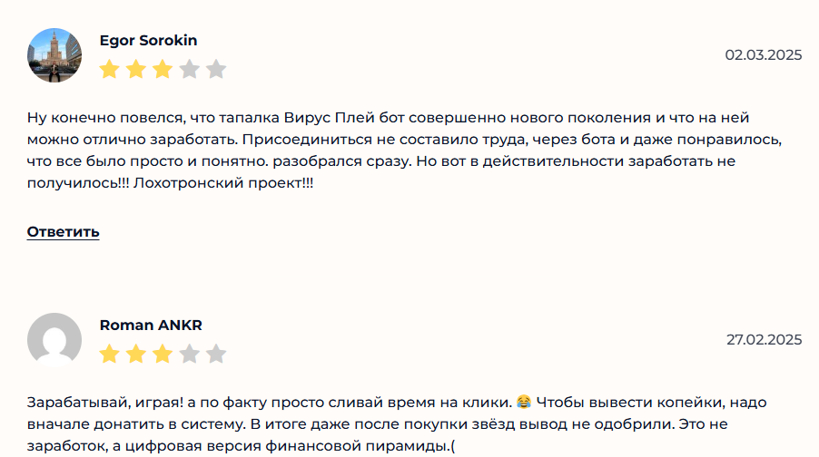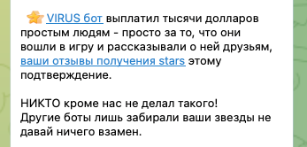 Изучив маркетинговые предложения проекта и обещания о раздаче крупных призов, многие пользователи задаются вопросом – кто финансирует Virusgift и не является ли это мошенничеством. Просмотрев комментарии и отзывы на канале и независимых сайтах, наша команда не нашла подтверждений обещаниям заработка. ТГ проект Virusgift для доступа к полному функционалу требует вложений, поэтому целью бота может быть исключительно обогащение создателей “вирусной игры”.