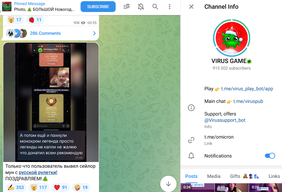 Об авторах VIRUS GAME BOT, @ virus play bot, информации нет ни в приложении, ни в официальном канале. На одностраничнике Virusgift pro представлена анимация. При этом объявленная в сообществе общая сумма розыгрыша призов превышает несколько десятков тысяч долларов. Без официальных данных о разработчиках подобные финансовые предложения могут оказаться классической приманкой. Единственный контакт техподдержки работает через аккаунт Virus Support, @ Virussupport bot.