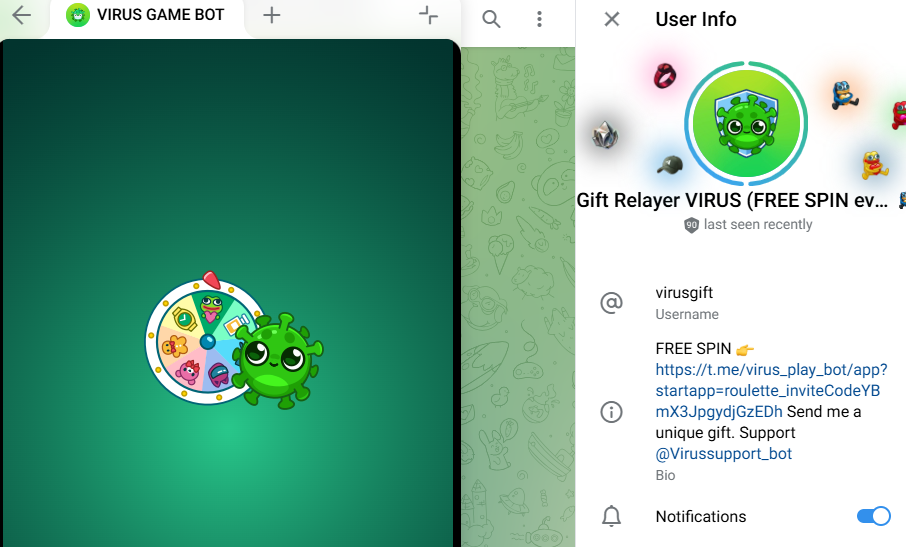 У проекта работает Телеграм аккаунт Gift relayer virus free spin every 24h. Профиль Gift relayer virus в Телеграмме, @ virusgift, имеет рефку на бота. Увидев предложение от Gift relayer virus получить уникальный подарок, воспользовавшись бесплатными спинами в рулетке каждые 24 часа, юзеры пытаются понять, что это за оффер – обман или нет. Сразу отметим, что все сообщения о том, что Gift relayer virus подарил подарок, никак не подтверждены.