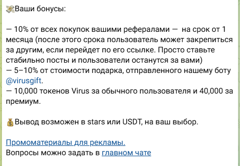 - награда за привлечение одного обычного участника составляет 10 000 токенов “Вирус”;