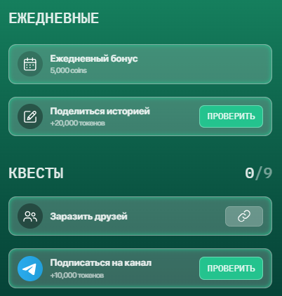 За ежедневное посещение бота начисляют 5000 игровых токенов. Если пользователь поделится историей, то на его счету прибавится еще 20 000 монет. Реферальную ссылку можно скопировать в этом же разделе. За привлечение 10 участников в проект бонус составляет 50 000, а если подписаться на страницу проекта в Telegram и соцсети X, юзер получит по 10 000 за каждое задание.
