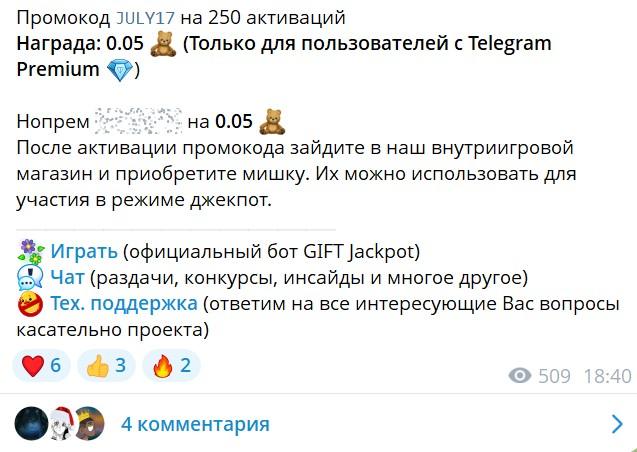 У проекта есть канал в ТГ – Gift Jackpot News (GiftJackpot). Число подписчиков – 37 228 человек. Здесь освещаются новости проекта, выдаются промокоды в Gift Jackpot («Гифт Джекпот») для участников, проводятся розыгрыши. Но активность в группе очень низкая. Посты регулярно читают в среднем 500 фолловеров. Реакции и комментарии оставляют единицы.