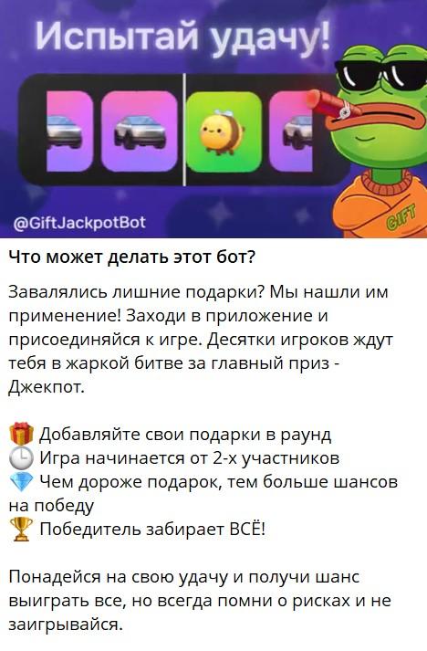 Бот GIFT Jackpot (giftjackpotbot) собрал приличную аудиторию – 28 197 человек. Представляет собой WEB3-игру, где пользователи могут участвовать в конкурсе, используя свои телеграм-подарки. Победитель всего один, и он забирает джек-пот, то есть все подарки, которые вложили остальные участники проекта. Чем дороже подарок, тем выше шанс выиграть.