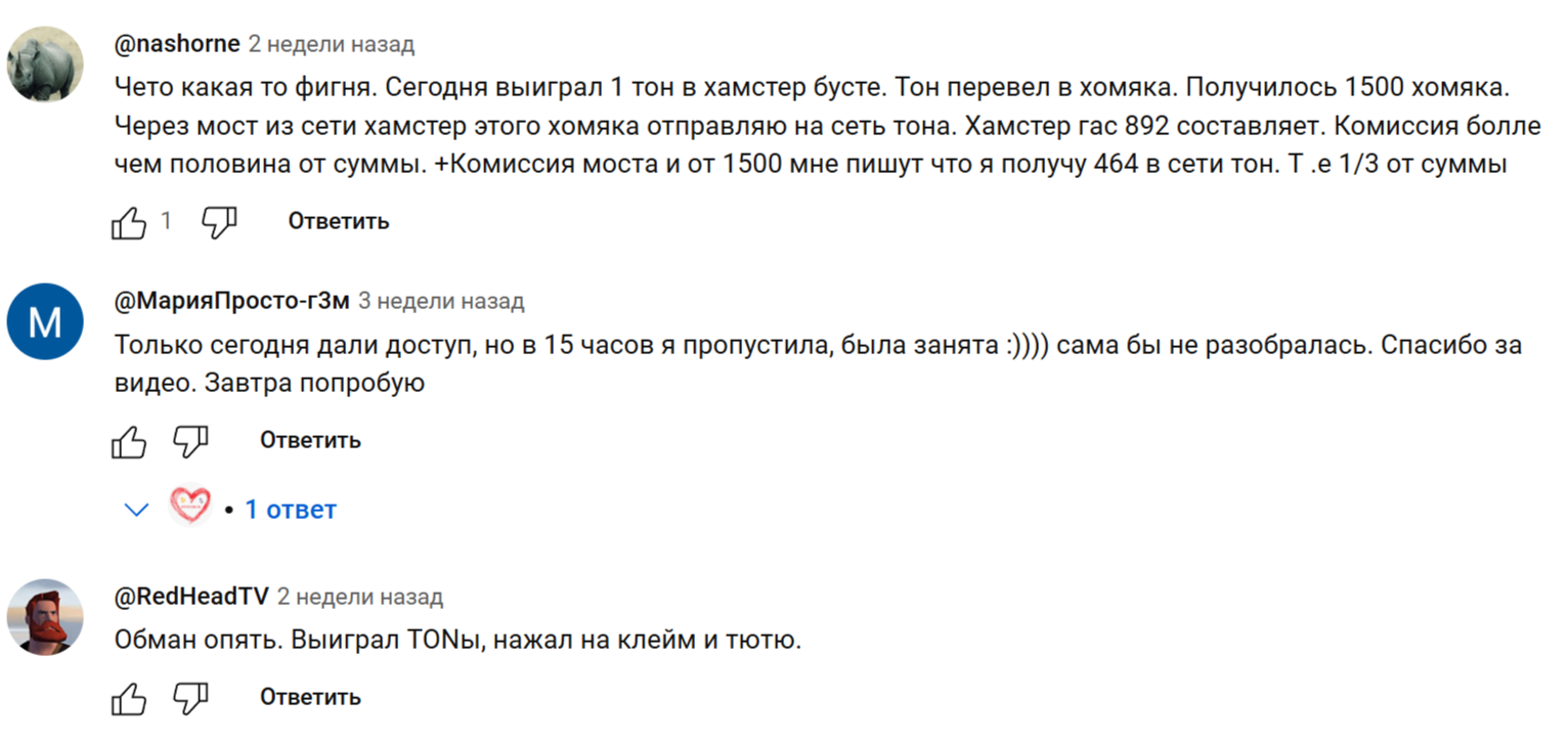 В комментарии пользователи часто спорят касательно Hamster Boost — обман или нет. Многие жалуются, что после получения прибыли так и не смогли разобраться с выводом денег. Чаще всего в комментариях отмечается высокая комиссия, которая делает транзакцию бесполезной.