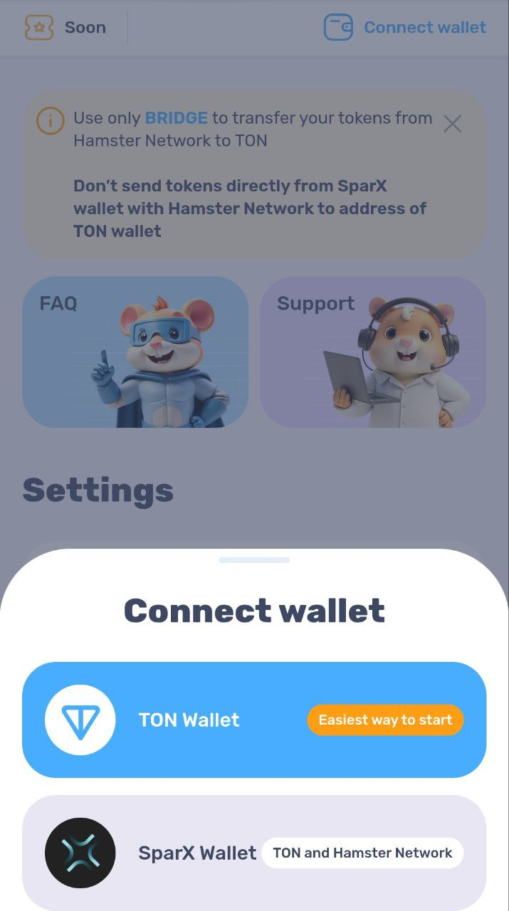 Для получения TON нужно знать, как подключить кошелек к Хамстер Буст. В описании говорится, что для участия в квесте можно обойтись без этого шага. При этом для дальнейшего вывода он является обязательным. Игра поддерживает SparX Wallet, а также TON Connect.