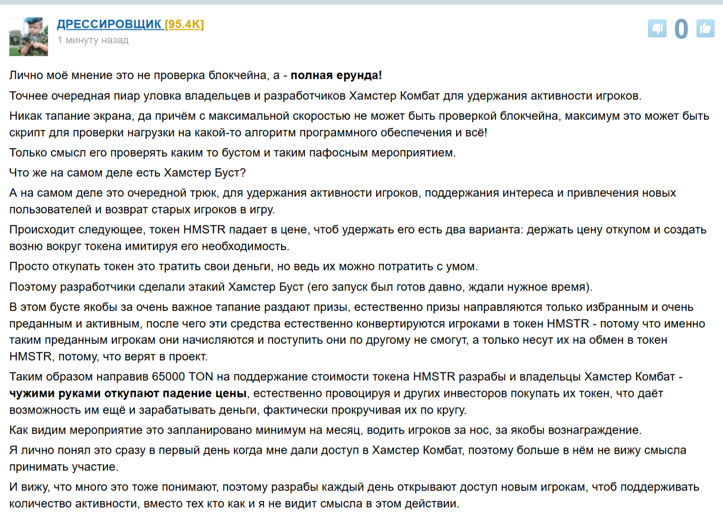 Есть мнение, что новый проект — полная ерунда. Он создан для того, чтобы поддерживать основную игру Хамстер Комбат и увеличить активность пользователей. Здесь клиентам раздают призы за тапание и участие в квестах, но собственной монеты нет. Проект в Telegram также не несет какой-то реальной пользы.