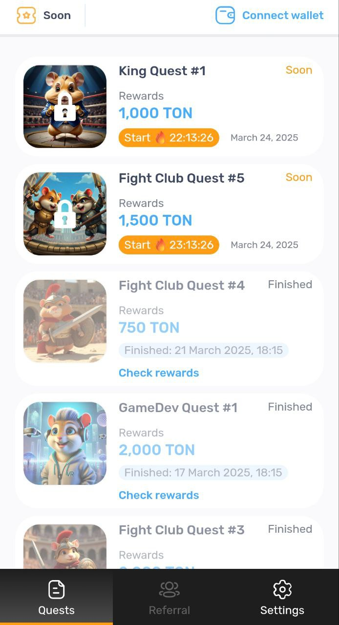 - Quest. Здесь игрокам предлагается большой выбор заданий. Для получения токенов можно проходить квесты и получать вознаграждения в размере от 1000 TON и более. Для удобства в каждом событии указывается дата начала соревнования. При этом новые этапы открываются только после завершения предыдущих.