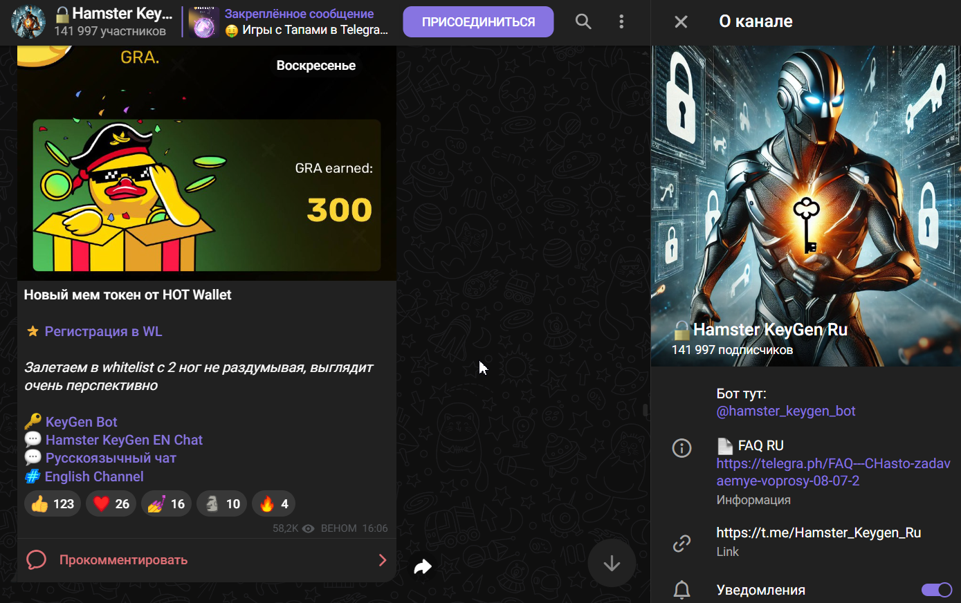 Проект “Хамстер Кей ген” был создан для рекламы и продвижения игр-тапалок. Администрация публикует посты с якобы лучшими инвестиционными проектами без рисков, сообщает:
