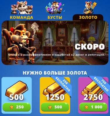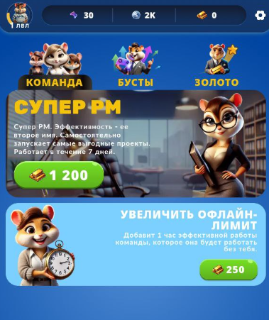 Пока что качать в Hamster Kombat Gamedev можно только команду и самого персонажа, вливая в это также stars. Заметно, что игра находится в бета-тестовом режиме и пока в нее еще не добавлены очень многие опции. Например, комбо, которое уже доступно в приложении как раздел, но кликабельным не является.