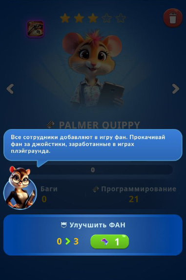 Открытие каждой новой игры приносит очки опыта для персонажей команды и дополнительные награды в виде серебра и значков медалей.Также все сотрудники приносят некий фан, который можно использовать, чтобы получать ответы на задания в Hamster kombat gamedev.
