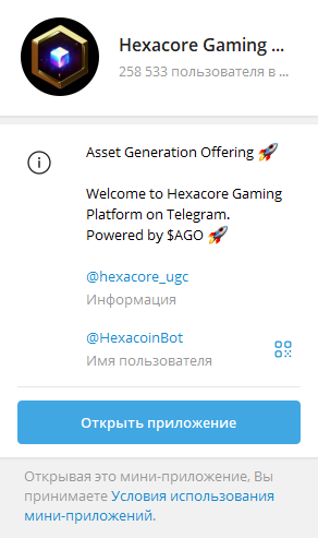 Hexacore RU — русскоязычный канал про игровой проект в Telegram, запущенный в 2024 году. Позиционирует себя как инновационная платформа Web3 с интеграцией NFT и блокчейна. Основной продукт — кликер-игра с элементами аркады, MMORPG и MOBA, где игроки зарабатывают токены AGO.
