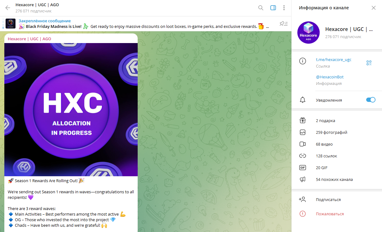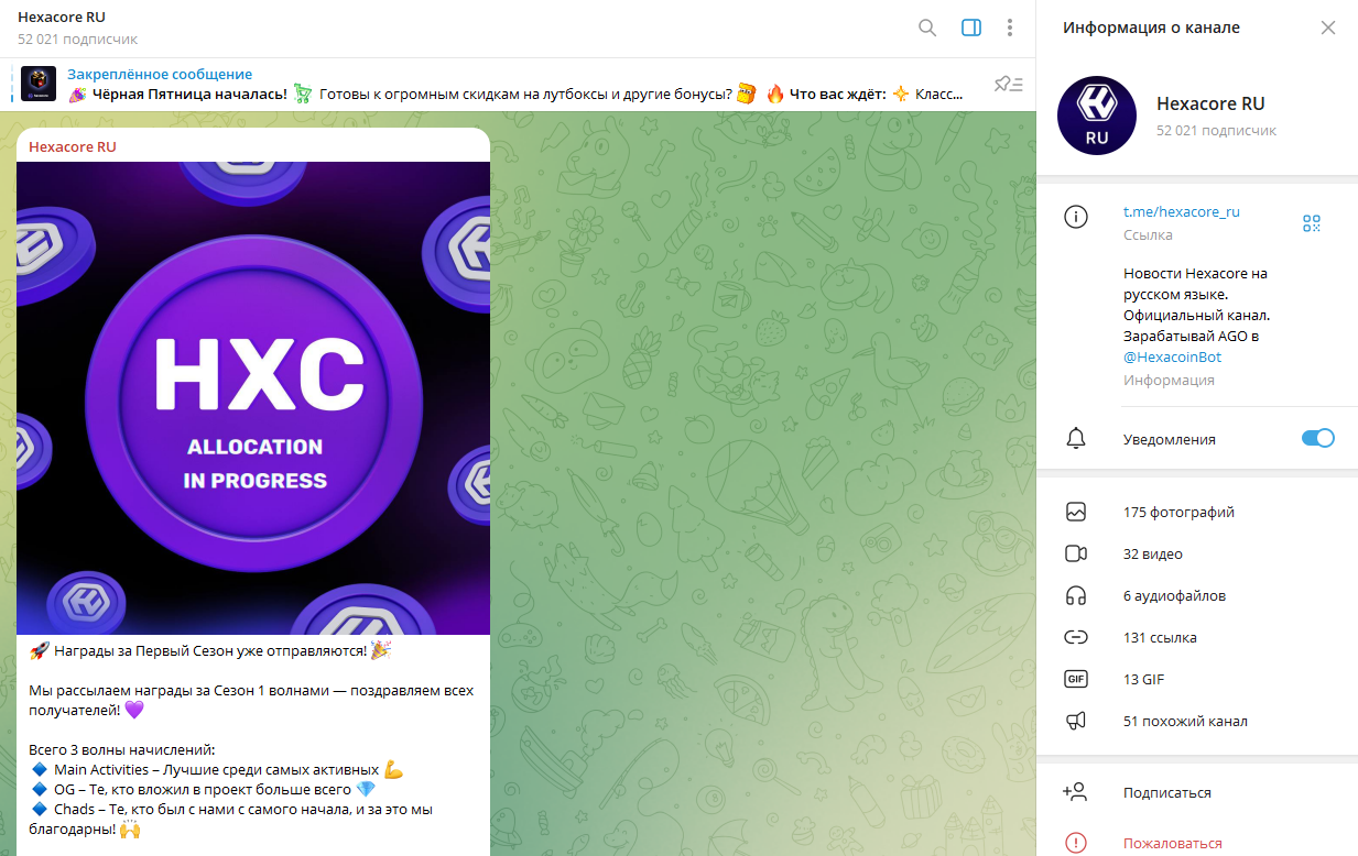 Официальный Telegram-канал Hexacore RU был создан 6 августа 2024 года. На нем более 52 тысяч подписчиков, но активность падает: за последние 2 недели аудитория сократилась на 3%.