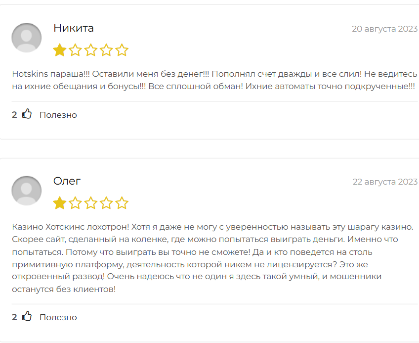 Так как настоящий ТГ-канал Hotskins удален, а сайты проекта не работают, можно сделать вывод, что он закрыт. Поэтому доверять другим телеграм-сервисам с наименованием «Хотскинс» не стоит. Однако и у реального онлайн-казино нет доказательств выплат игрокам.