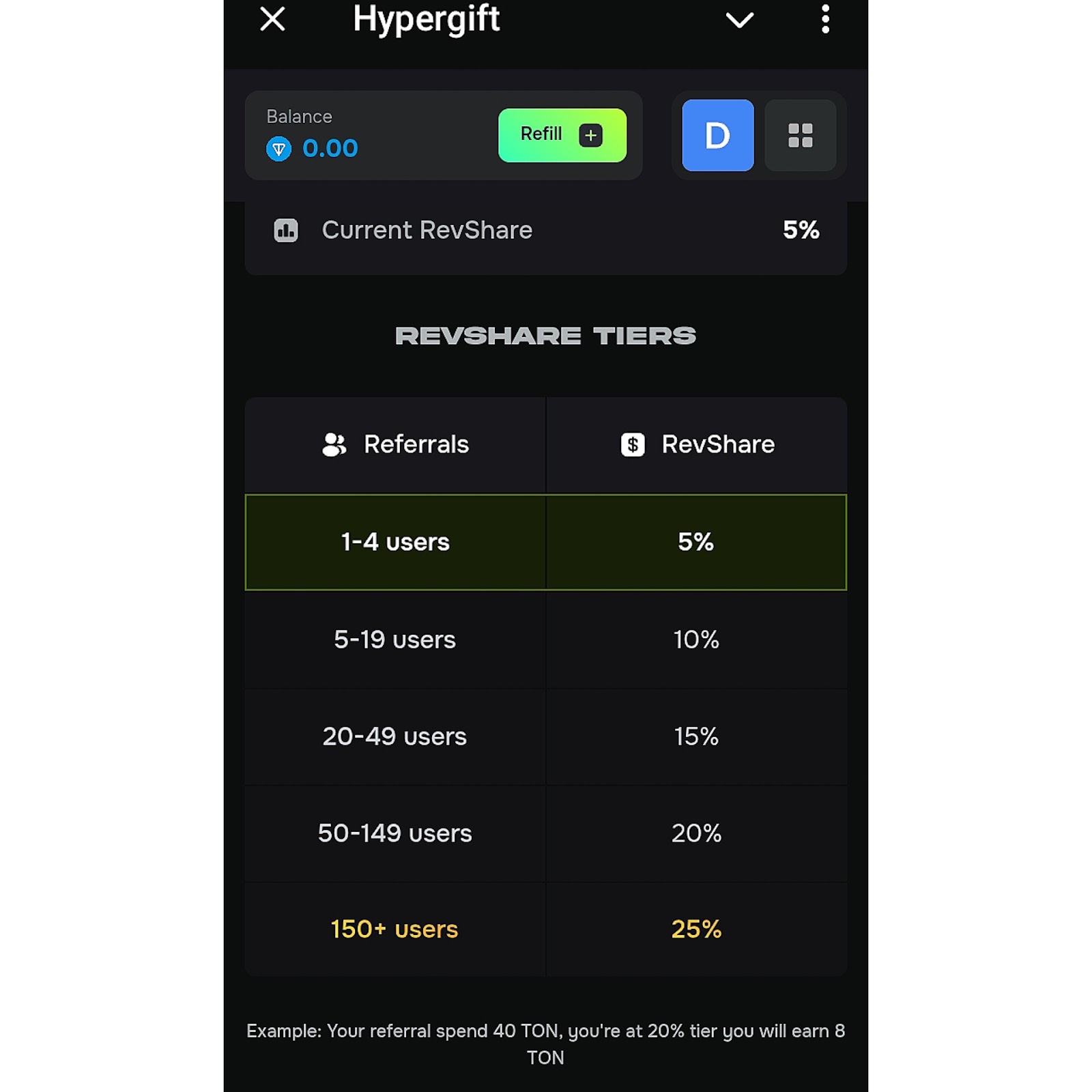 • 1-4 реферала — 5% начислений;