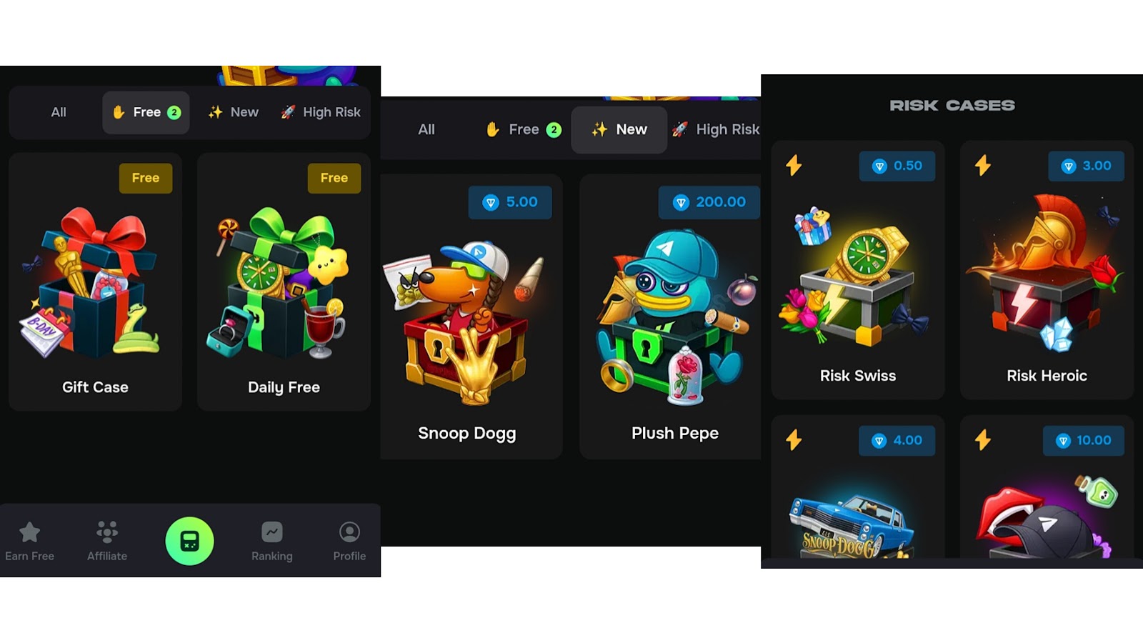 • “New”. Здесь собраны недавние кейсы, и сейчас среди доступных Snoop Dogg за 5 TON, а также Plush Pepe за 200 TON;