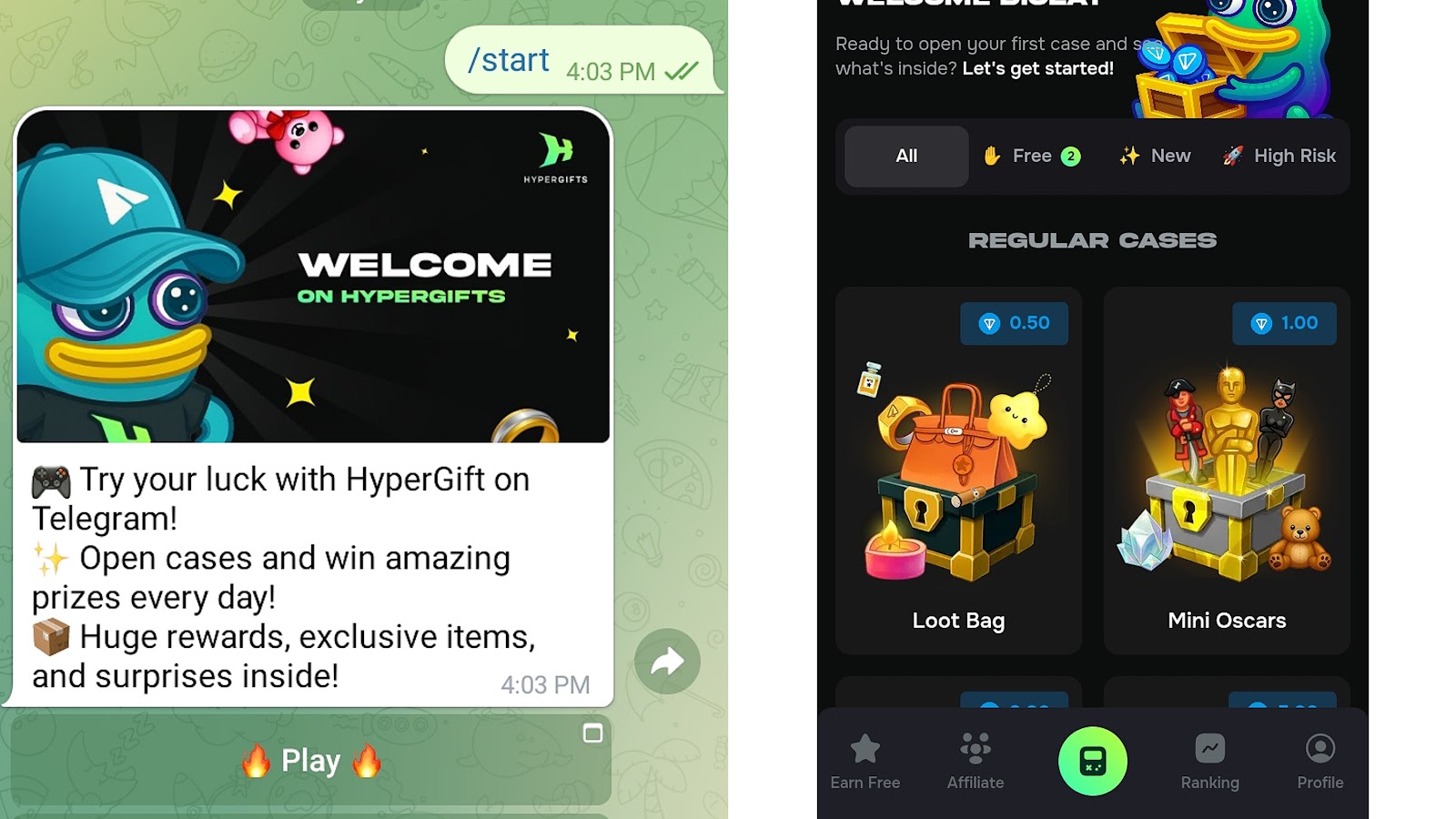 После того как пользователь запустит тг-бота, должен нажать на “Play”. Аккаунт будет создаваться на основе Телеграмм страницы участника. Язык интерфейса здесь английский, и функции сменить его нет. Hypergifts bot состоит из таких разделов: