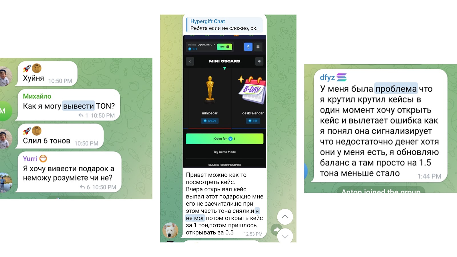 У проекта есть чат, в котором встречаются жалобы на то, что во время открытия платных кейсов происходит ошибка, и боксы не открываются, но с балансов списываются средства.