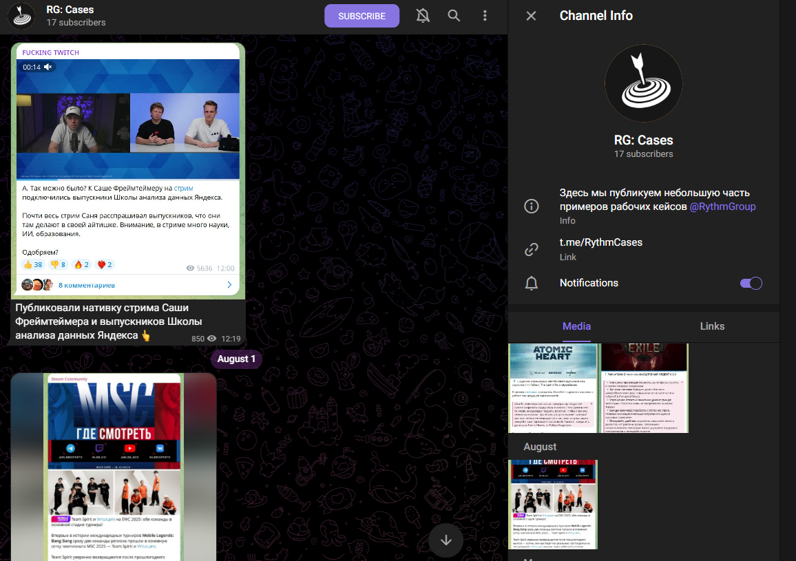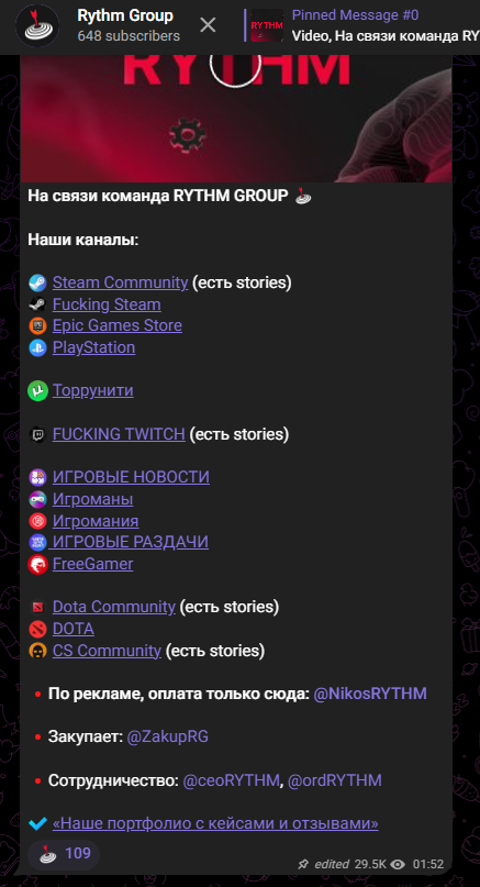 Сообщество Gamegiveaway было создано в 2019 году, его аудитория составляет 34 000 человек, из которых более 16% регулярно читают посты. Комментарии закрыты, канал имеет регистрацию в РКН. Владельцем выступает команда RYTHM GROUP, им принадлежит 14 ТГ сообществ, включая Dota (53 000 подписчиков), CS Community (56 000 пользователей), Steam Community (570 тысяч человек) и Epic Games Store (более 87 000 подписчиков). Есть администратор, закупающий рекламу для продвижения проекта, nikosRYTHM — к нему можно обратиться для оплаты рекламных постов в RYTHM GROUP.
