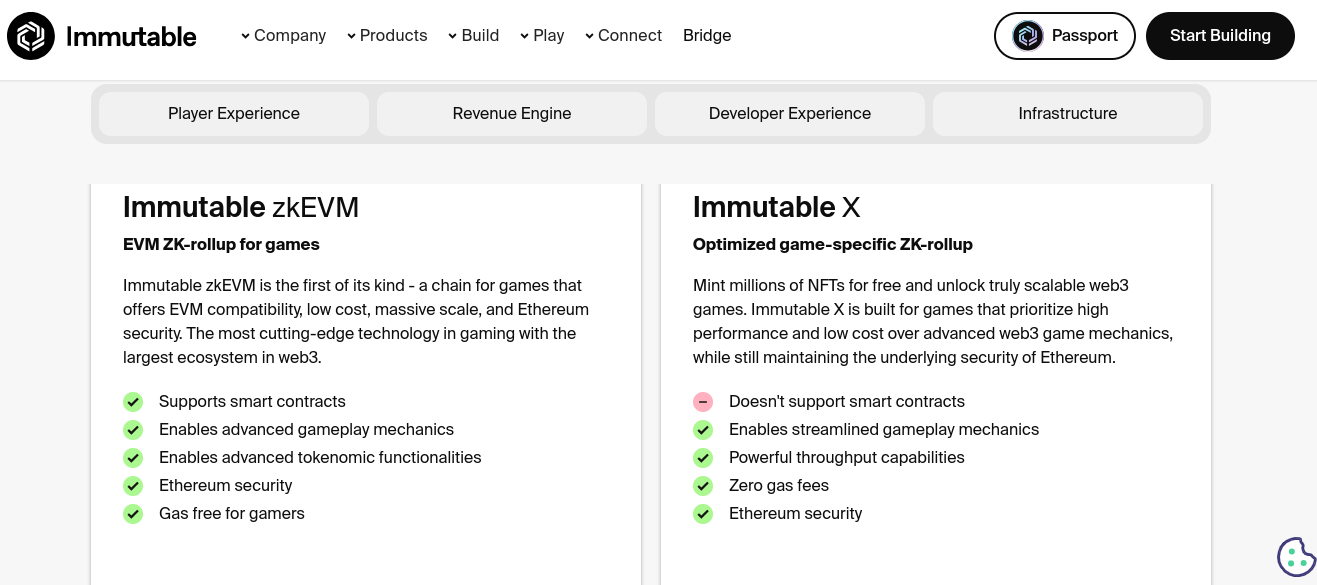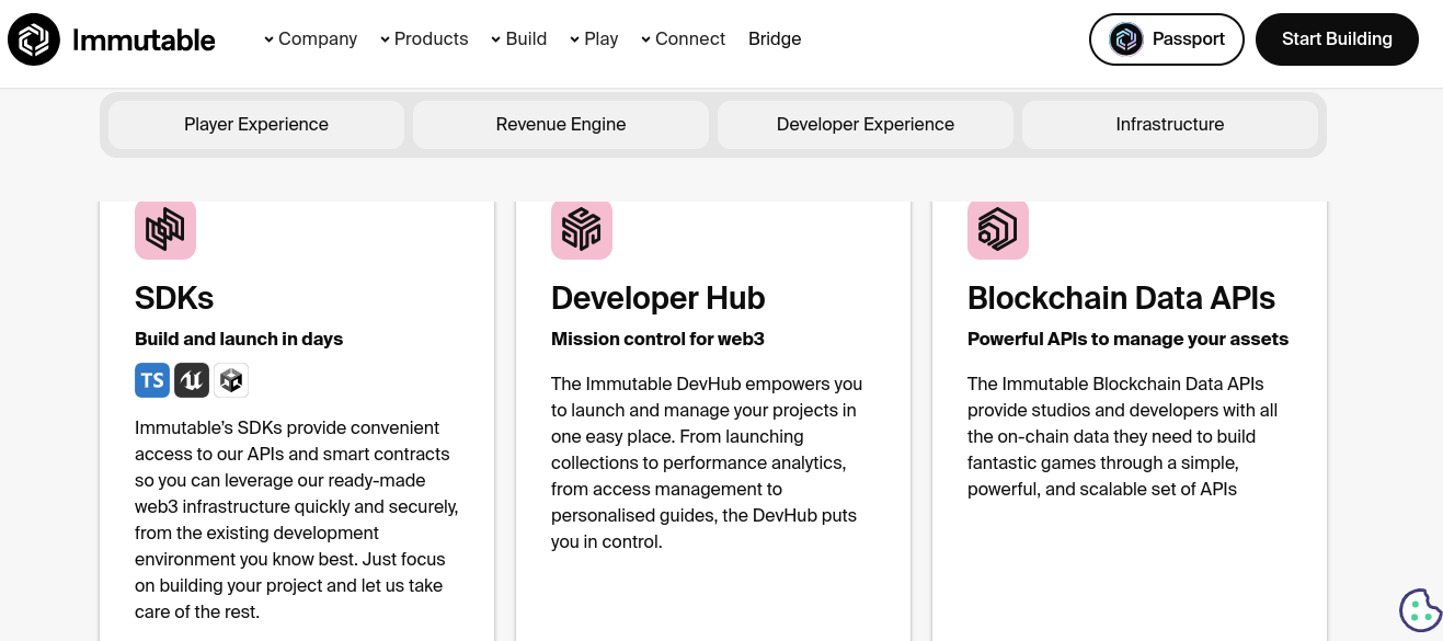 Infastructure. Технический инструментарий. В частности Immutable zkEVM — блокчейн с надстройками под разработку игр. Поддерживает смарт-контракты, расширенные игровые механики, защищенность эфира и нулевой газ. Immutable X — специализированная сеть.