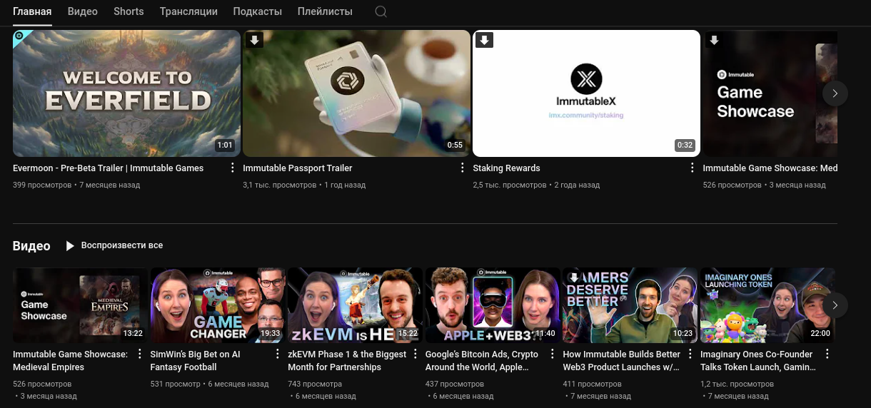 Вещает криптовалютный marketplace Immutable x NFT с 18 марта 2021 года. За все время существования канала суммарная активность пользователей составила чуть более 155 тысяч просмотров.