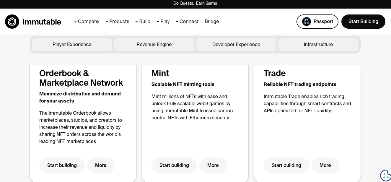 Криптовалютный marketplace Immutable x NFT отличителен расширенной спецификой сотрудничества с пользователями. Специально под это и заточен функционал платформы. Для разноплановой работы сервис предоставляет следующий инструментарий:- Player Experience.