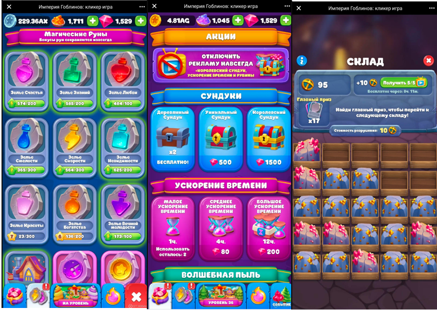 Донат предлагается в виде ускорений, дополнительных ресурсов, пропусков прогресса и усилений, которые позволяют быстрее прокачивать мастерские и гоблинов. Формально играть можно и без вложений, и первое время это действительно так, но чем дальше, тем сильнее прогресс начинает замедляться.