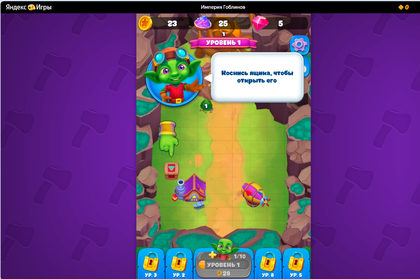 Игроку показывают карту, простые задания, дают первых гоблинов, объясняют механику объединения, апгрейдов и накопления ресурсов. Интерфейс яркий, прогресс идет быстро, уровни открываются один за другим, а внутриигровые награды насыпают быстро.