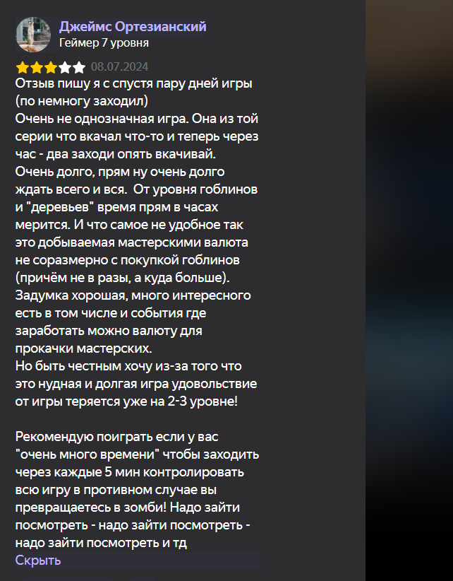 Империя гоблинов — игра донатно-ориентированная, с жестко настроенной экономикой. Она подходит для короткого ознакомления и короткого времяпровождения, но не для долгой честной игры без вложений.