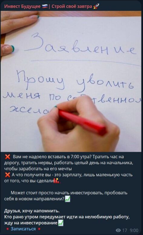 Весь контент в канале – это умелая игра на эмоциях. Например, постят картинку с рукописным заявлением об увольнении, а под ней – цепляющие за живое вопросы: «Вам не надоело вставать в 7:00 утра. Тратить час на дорогу, работать целый день на начальника, чтобы зарабатывать на его мечты».