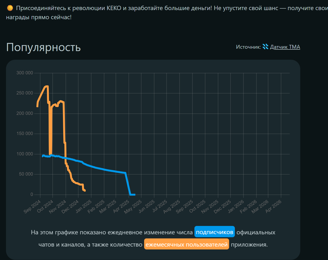 Приложение Keko Killer bot запущено еще летом 2024, основной поток игроков пришелся на осень того же года. На момент написания обзора бот не работает, социальные сети удалены. Игра обещала пользователям простой функционал: игрок создает свою монету, прокачивает ее и пытается взлететь в топ. Если он занимает лидирующие позиции, то может претендовать на DEX TON.