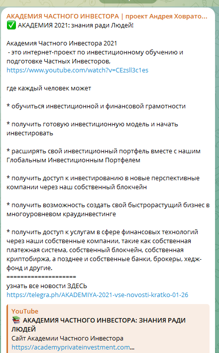 Ховратов Андрей Федорович – известный инвестор и бизнес-тренер, основатель «Академии частного инвестора». Она активно продвигалась через его каналы в YouTube и Telegram. Академия предлагала обучающие курсы по инвестициям. Однако последние два года деятельность andreykhovratov com временно прекратилась.