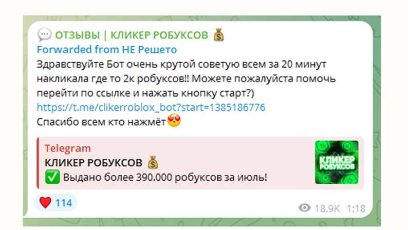 Но суть проекта была довольно проста. Следовало запустить мини-приложение «Кликер Робуксов» telegram через Clikerroblox bot. И в нем выполнять простейшие действия, за которые участникам якобы начислялись робуксы. А их в оригинальной игре участники покупают за деньги, чтобы прокачивать героев и менять скины. К сожалению, более подробных данных об игровой динамике и сюжете мини-приложения не сохранилось.