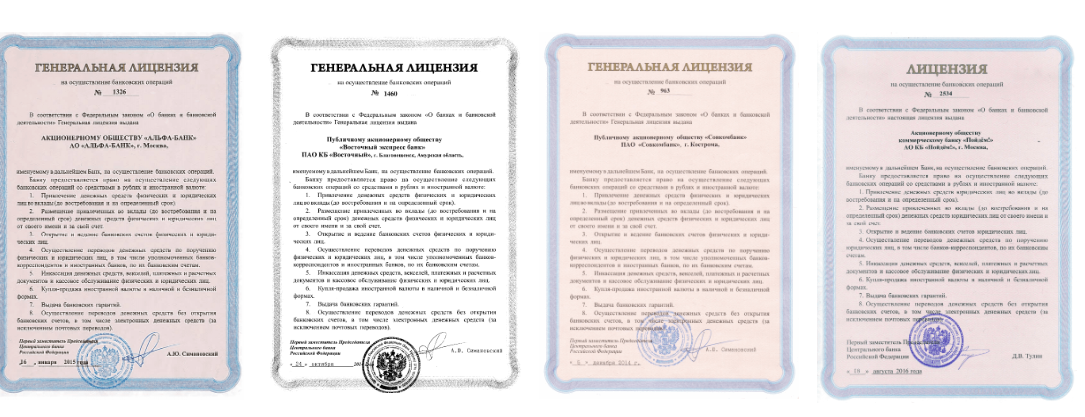 - Сомнительные лицензии. На сайте приводится целый ряд лицензий, которые позволяют осуществлять банковскую деятельность Альфа-Банку, Восточному Экспресс-банку, Совкомбанку и другим финансовым учреждениям. Все они не имеют никакого отношения к героине материала. Для чего эти документы приводятся на сайте — вопрос.