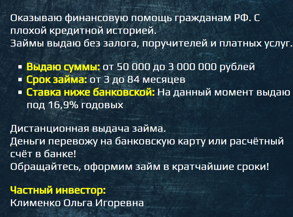 Несмотря на небольшое количество отзывов, инвестор и частный кредитор Клименко Ольга Игоревна пытается продвигать услуги по выдаче займов. Она обещает дать в долг клиентам сумму от 50 тысяч до 3 миллионов рублей. Для привлечения внимания девушка выделяет следующие особенности сотрудничества: