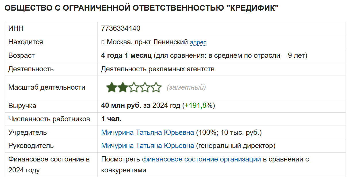 В футере сказано, что героиня обзора ведет деятельность под именем ООО Кредифик. Проверка показала, что такая компания действительно существует. Он находится в Москве, на Ленинском проспекте в доме 87. В качестве основной деятельности заявлена работа рекламных агентств.