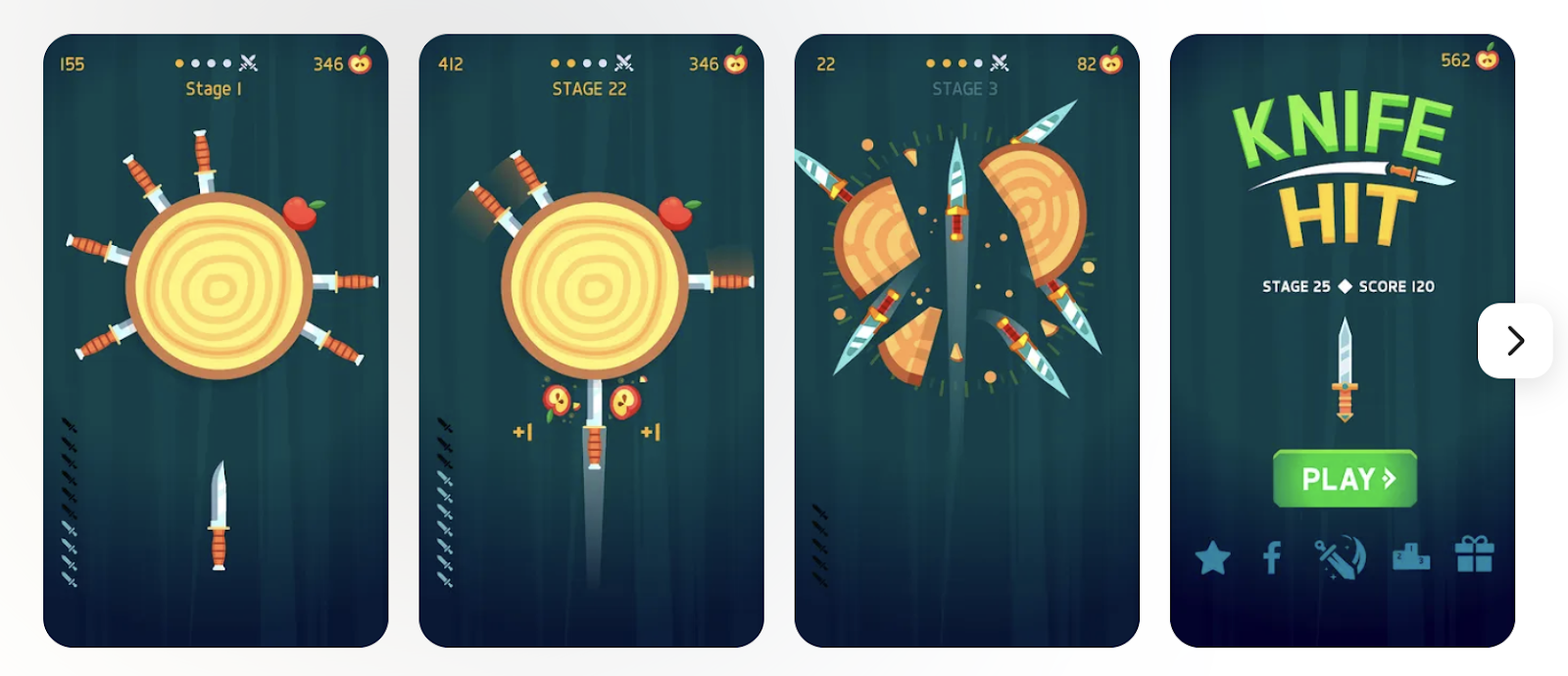 В Knifehit нет классической валюты, но есть скины/ножи/боссы, которые выступают в роли маркеров прогресса. Кнайф Хит ножи открываются за прохождение этапов и сбор яблок. Формально это косметика, но на практике это психологический якорь.