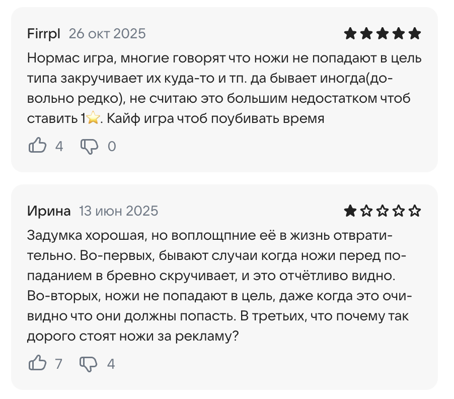Отзывы об игре Knife Hit очень противоречивые и разносторонние. Один из самых частых триггеров — реклама. Пользователи прямо пишут, что рекламы в приложении чересчур много и она мешает. Также некоторые игроки отмечают, что иногда клинок будто уводит в сторону перед самым попаданием. Часть аудитории считает это багом, часть – намеренным усложнением. При этом можно встретить и позитив от игроков.