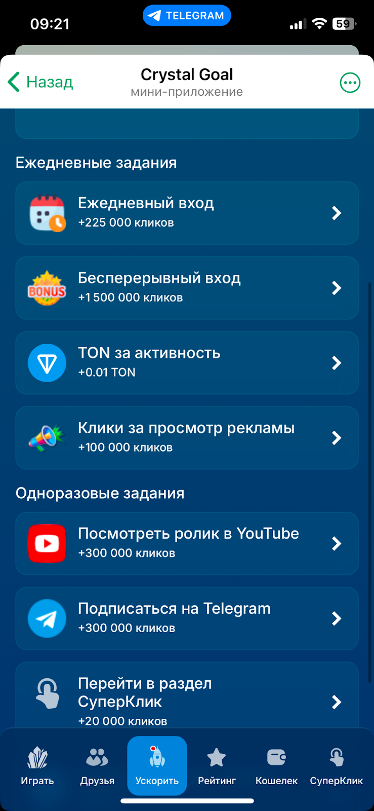 Чтобы подолгу не ожидать восстановления энергии, можно выполнить задания. Они находятся в разделе «Ускорить». За завершение задач моментально дают большое количество кликов, вплоть до нескольких сотен тысяч.