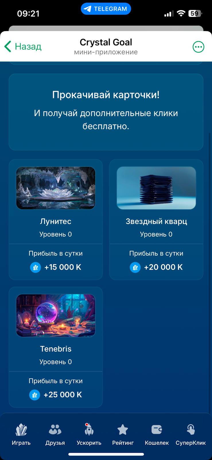 В Crystalton bot есть система карточек, как в Hamster Kombat. Но вместо монеток в этой игре дают определенное количество кликов в сутки.