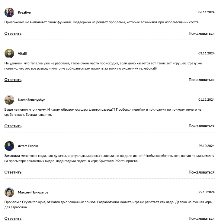 Также люди недовольны форматом распределения призов. Они отмечают, что для того, чтобы заработать в приложении «Кристалл Клик» минимальную для вывода сумму, нужно «годами» смотреть рекламу.