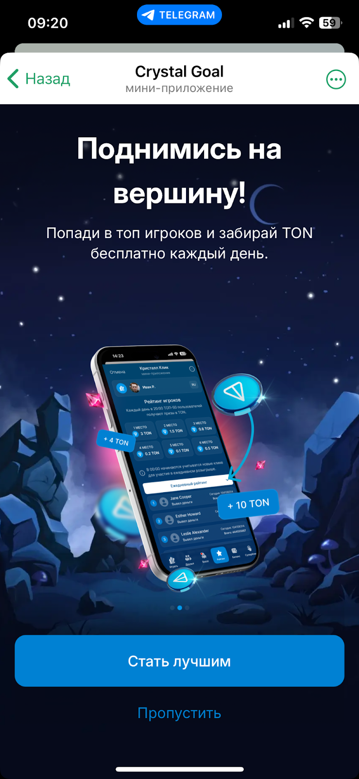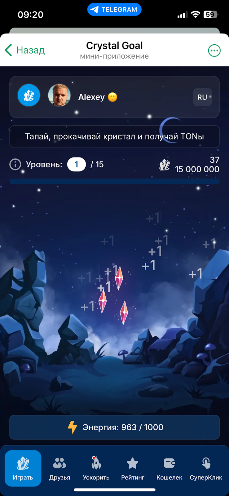 «Кристалл Клик» – игра-тапалка в Телеграмм. Ее создатели обещают выплачивать токены ТОН за проявляемую в приложении активность.