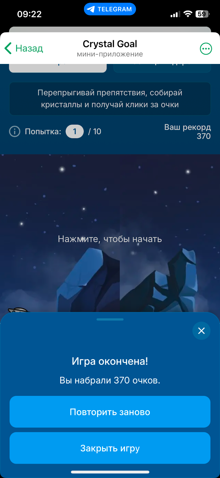 Под велком-месседжем находится пара кнопок. В результате нажатия на «Запустить игру» во встроенном в Telegram браузере откроется мини-приложение.