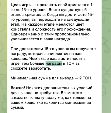 Как заявлено разработчиками, способ, как вывести деньги из «Кристалл Клик» появляется после того, как игрок достигает 15-го уровня. Дополнительное условие – требуется накопить на балансе сумму от двух TON.