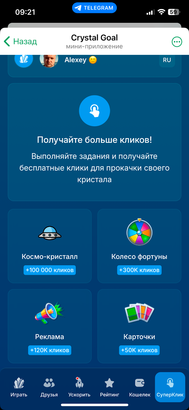 Также в приложении есть мини-игры, за участие в которых можно получить бонусные нажатия. Их перечень представлен в разделе «СуперКлик».