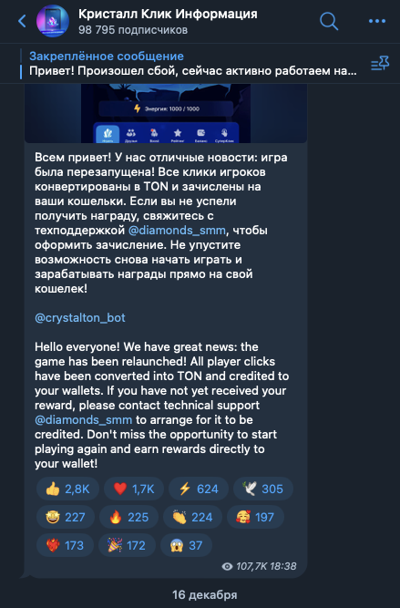 На телеграмм-канал «Кристалл Клик Информация», crystal tasks, на 25 декабря 2024-го года, подписано около 99 тысяч пользователей. Публикации просматривают в среднем 100 тысяч раз.