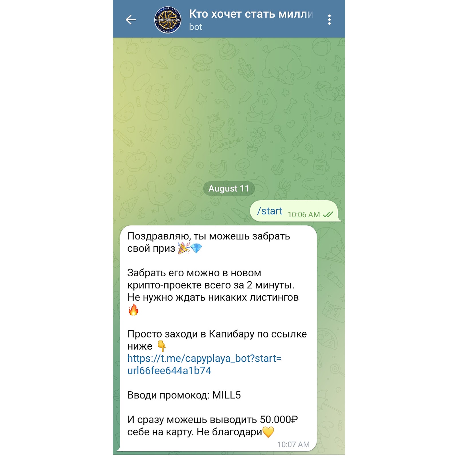Из таких условий очевидно, что основатели зарабатывают на реферальных программах, а также могут продвигать сомнительные ресурсы. Дополнительных заданий игрокам не предлагают. Основатели Кто Хочет Стать Миллионером пытаются убедить в том, что после регистрации в предложенных ботах можно выводить средства прямо на банковские карты. Однако есть риск слить конфиденциальную информацию подозрительным личностям.